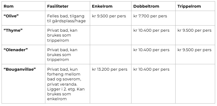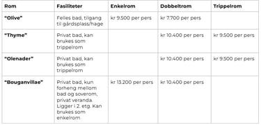 Pris fra 7.700 - 13.200 avhengig av romvalg.